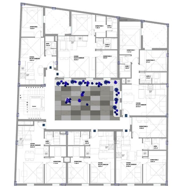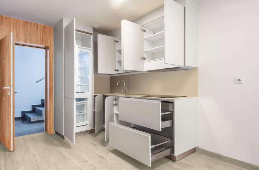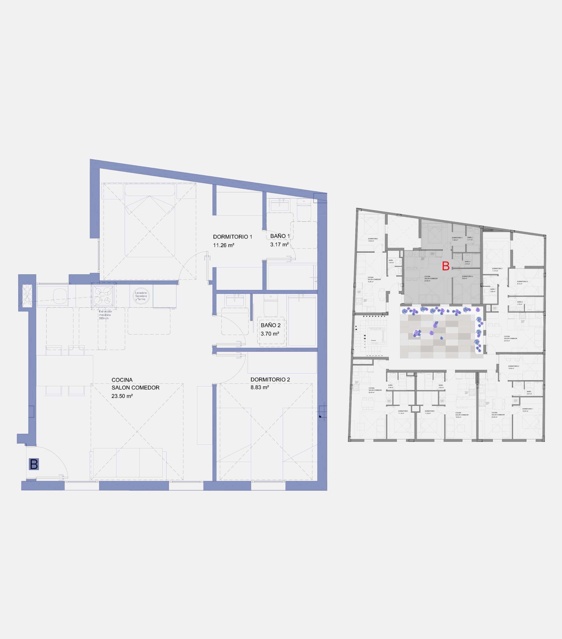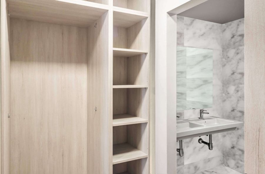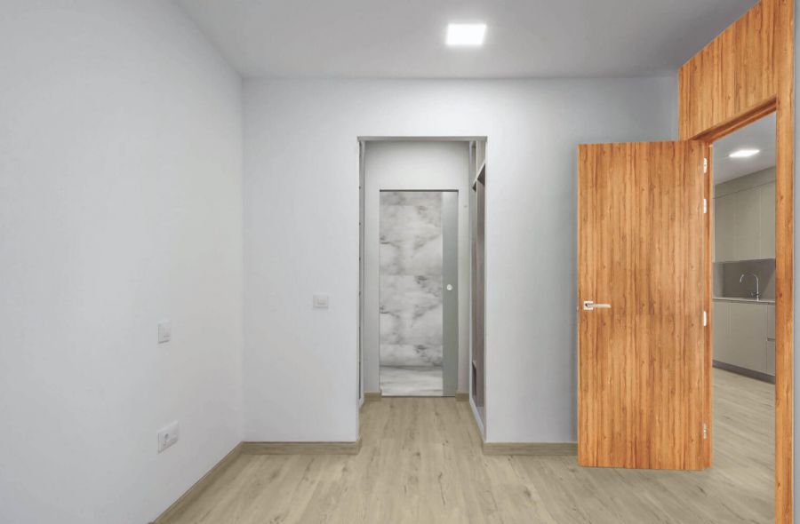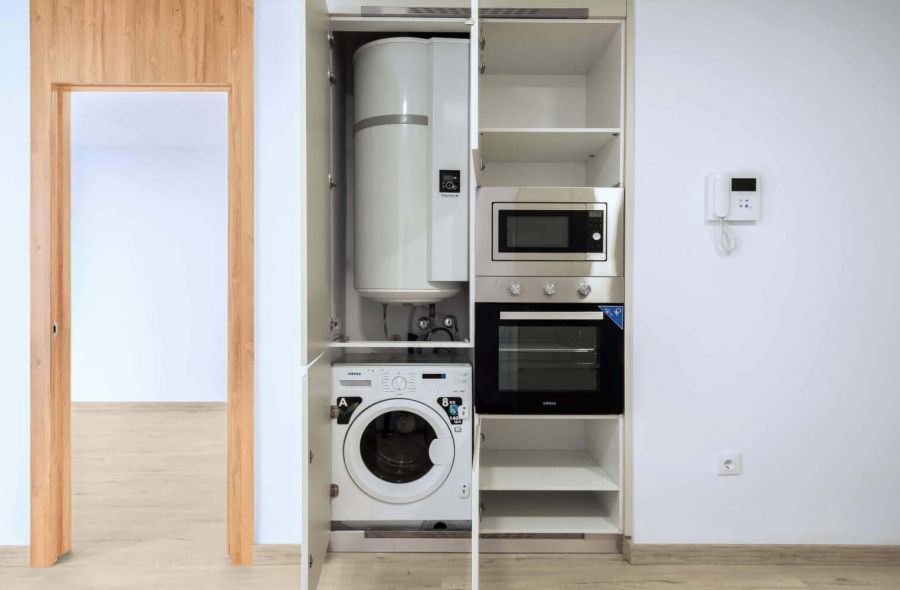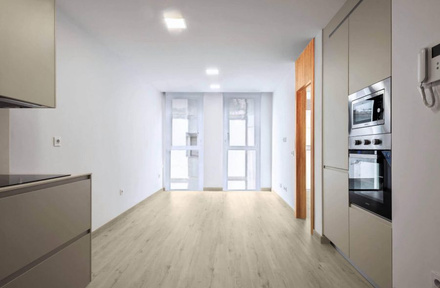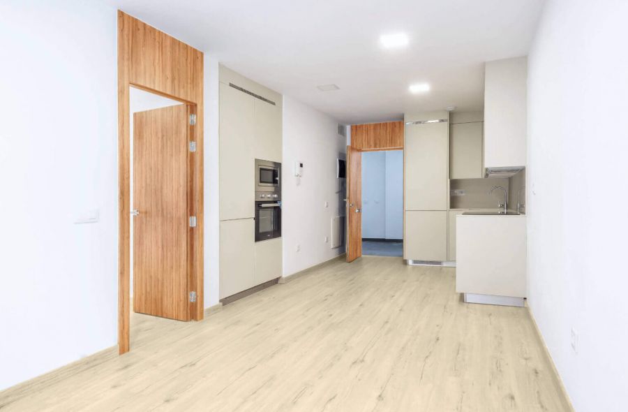 Apartamento de 2 dormitorio Puerta de acceso de seguridad con bisagras antipalanca y tres puntos de anclaje. Puertas de paso y armarios hasta el techo con base encapsulada en chapa de madera natural con herrajes de alta calidad. Dormitorio principal equipado con armarios o vestidores. 2 baños completos modernos y elegantes con pavimento y paredes aplacadas en mármol natural e inodoro suspendido, lavabo encimera, columna de ducha y griferías marca ROCA. Cocina con muebles altos y bajos, con encimera COMPAC y herrajes de alta calidad. Electrodomésticos, que incluyen horno convencional, placa de inducción, campana extractora y lavadora y frigorífico integrado.